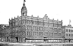 Their next acquisition was the two-storey building erected for the watchmaker and jeweller John Davis at No. 32. The upper floor had been successively used as a Masonic Hall, billiard room for the adjacent Globe Hotel, and finally Woodman's music and pianoforte salerooms, before becoming Marshall's millinery department, with china, earthenware and ironware on the ground floor.[4] By 1900 the firm had seven partners: James Marshall, William Taylor, James Windmill Porter,[15] Frederick Allen Lakeman,[15] James Carlyle Marshall, Frederick Windmill Porter, and Arthur Roy Taylor, the last three being sons of the principals.