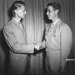 James McCormack (right) is congratulated by Major General Lauris Norstad after being presented with the oak leaf cluster to his Legion of Merit