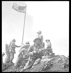 The flagstaff was then carried to the highest point on the crater and raised and planted in the ground by Schrier, Thomas, and Hansen at approximately 10:30 AM.[3] Seeing the raising of the National colors immediately caused a cheering reaction from the Marines, sailors, and Coast Guardsmen on the beach below and from the men on the ships near the beach at the southern end of the island. After the flag was raised, Michels was photoed near the flagstaff by Marine Corps photographer Staff Sergeant Louis Lowery. In the photo he is shown holding a M1 carbine in a defensive position.[4] Shortly thereafter, fighting took place between the Marines and Japanese because of the flag raising, the Japanese were hiding in caves on the mountain when they saw the flag go up.
