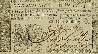 In 1760s, the Woodbridge Township press governed the printing of colonial currency for the crown colony of New Jersey. The Province of New Jersey issued paper money depicting the unit of account for colonial currency reciprocal of the Carolingian monetary system.