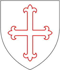 Columns in the painting are a stylised representation of Durham Cathedral. On the left column is an heraldic escutcheon displaying the arms of Sir Robert Pilkington, second son of Sir Roger Pilkington (died 1347), lord of the manor of Pilkington, Stand: Argent, a cross patonce gules voided of the field, with a crescent azure for difference of a second son, in the dexter chief, surmounted by the crest, A mower with his scythe.