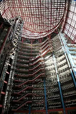 The Thompson Center's atrium is one of several to be built in Chicago during the 1980s.[196] Visitors to the Thompson Center's interior see all 17 floors layered partway around the atrium in a semicircular curve.[193][191] The roof of the atrium rises 160 feet (49 m) above the floor;[21][190] due to its height, the atrium has been the location of several suicide attempts.[197] The original plans for the atrium called for stainless-steel wall panels, alternating with black and white panels,[21] and there was a rosette at the center of the granite floor.[2] The building also included an exterior waterfall, with a basin extending indoors into the atrium.[21][190][193] In addition, the atrium included open-air escalators, along with glass-covered elevator shafts,[21] similar to the elevator shafts in John Portman's hotels.[190] Balconies and criss-crossing stairways were also located within the atrium,[21][190] and a gallery with a 42-inch-tall (1,100 mm) handrail encircled the atrium on every floor.[198] Commercial space took up the basement, first, and second stories,[46][48] and there was also a 600-seat auditorium.[13]