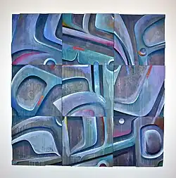 In 1973, Schoppert came to Anchorage for a construction job which, it turned out, was no longer available.[3] On February 26 of that year, using the last of his money, he bought a piece of soapstone and carved an owl.[4] He put it up for sale at the urging of his sister and was able to sell it quickly, which marked the formal beginning of his career as an artist.[4] Understanding that knowledge was important, he went on to earn a BFA from the University of Alaska Anchorage and a MFA from the University of Washington. But "his apprenticeship was with himself" according to Steven Brown, associate curator at the Seattle Art Museum.[1][3] Continuing to produce work while still an undergraduate, he won first place in the statewide Earth, Fire and Fiber juried show in 1976.[3] This sculpture should have been an indication of things to come as it was a separation from his customary work which would define him as an artist and create controversy and curiosity in later years. Although he created art using the formline, he chose a different approach for a great deal of his work that did not neatly fit into either mainstream or Northwest Coast art. He was quoted as saying "There is tremendous pressure for conformity from collectors and scholars, who want work that fits into the classic definition of Northwest Indian art. When things don't fit their expectations there's a raised eyebrow, and a sort of suggestion of 'What do we do with it now?'".[1] This mindset is what allowed Schoppert to create his most recognizable pieces which are large carved panels made of multiple planks, painted in colors not associated with historical Tlingit carving, and the planks rearranged to create an entirely new look and a break from established methods and formline. Examples of this style are seen in his works Teasing Eagle and Raven Opens Box of Stars.