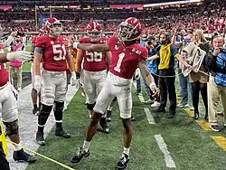 Williams was named a starter for the Crimson Tide going into his first season with the team.[16] He made an instant impact with four receptions for 126 receiving yards and one touchdown in a 44–13 victory over Miami in the Chick-fil-A Kickoff Game.[17] He was named the Southeastern Conference (SEC) Special Teams Player of the Week for week 4 after returning three kickoffs for 177 yards and two touchdowns and also caught an 81-yard touchdown pass in a 63–14 win over Southern Miss.[18] He had ten receptions for 146 receiving yards and two touchdowns in the 41–38 loss to Texas A&M on October 9.[19] On November 6, he had ten receptions for 160 receiving yards and one touchdown in a 20–14 victory over LSU.[20] One week later, he had six receptions for 158 yards and three touchdowns in a 59–3 victory over New Mexico State.[21] In the following game, against Arkansas, he had eight receptions for 190 receiving yards and three touchdowns in the 42–35 victory.[22] In the SEC Championship, a 41–24 victory over Georgia, he had seven receptions for 184 receiving yards and two touchdowns.[23] Williams was named first-team All-SEC and All-American as well as second-team All-SEC as a return specialist[24] and the conference's co-Special Teams Player of the Year.[25][26] Williams suffered a torn ACL in the 2022 College Football Playoff National Championship rematch with Georgia.[27] He finished the 2021 season with 79 receptions for 1,572 yards and 15 touchdowns.[28] He led the SEC in receiving yards, yards per reception, and receiving touchdowns.[29] He declared for the 2022 NFL draft following the championship game and began to rehab from the injury.[30] Jameson would finish up his Alabama career with a 2021 Sec Championship, and a 2021 Cotton Bowl win.
