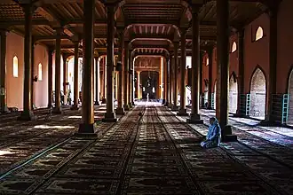 Its walls, made of burnt bricks, are over 1.2 metres (4 ft) thick. The lower portion of the walls is made of rectangular stones. There are three big entrance gates on north, south and eastern sides of the mosque confronting three turrets standing on lofty columns of deodar wood.[26] The eastern side has a large entrance called the Shah Gate which is covered with a pyramidal roof surmounted by a square open pavilion (brangh) with a spire on top.[4] A total of 378 wooden columns support the roof. Each turret is supported by eight lofty pillars 15 metres (48 ft) high and 1.8 metres (6 ft) in girth. The mihrab too has a similar turret over it. The remaining interior of the Mosque has 346 columns 6.4 metres (21 ft) high and 1.5 metres (5 ft) in girth. Initially the roof was covered with birch bark and clay.[26][27] The western wall of the cloister has a mihrab made of black Kashmiri marble which is adorned with calligraphic work and has the ninety-nine attributes of Allah engraved on it.