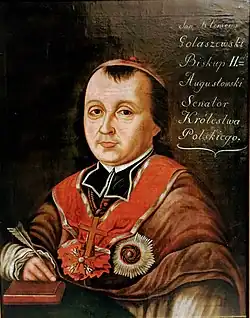On 26 June 1805, Gołaszewski was appointed bishop of the Diocese of Wigry by Pope Pius VII; he was consecrated on 5 March 1809 in Warsaw by Ignacy Raczyński, with his co-consecrators being Tymoteusz Gorzeński and Antonin Malinowski.[5] He was made a senator of Congress Poland in 1808, which he served as until his death in 1820;[6] while a senator, he served on committees for religion and public blessing, and was later awarded the Order of Saint Stanislaus, 1st class.[7] On 30 June 1818, the Diocese of Wigry was dissolved and Gołaszewski was made bishop of Sejny.[8] He died on 8 March 1820 and was buried at the Church of the Holy Cross on 11 March.[7]