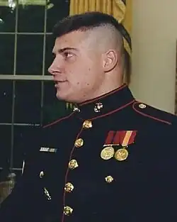 Kroc served in the United States Marine Corps[15] from 1991 to 1995 and was selected for presidential security duty serving under President Bill Clinton. The tour of duty included time in Washington, D.C., providing security for military officers at the Pentagon and for some of the Joint Chiefs of Staff from 1992 to 1994. Assigned to security duty for Warren Christopher (then Secretary of State) during the United Nations conferences in 1993, Kroc was later assigned to the security force at the presidential retreat at Camp David from 1994 to 1995.
