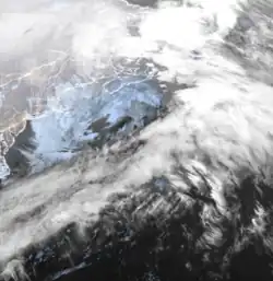 Because of its speed, the system's extent moved through the Northeast fast, which limited the extent of snow accumulation. As a result, snow from the nor'easter tapered off west to east, and by 12:00 UTC that day, the system was already located near Atlantic Canada.[5] Three hours later, after the system had completely exited the U.S., the WPC issued its second and final storm summary bulletin on the storm;[6] by this time, rapid deepening was beginning to ensue as it made landfall on and pass through Atlantic Canada, with the central pressure down to 984 mb (29.1 inHg) – a drop of 24 millibars (0.71 inHg) from a day prior.[5][7] Rapid strengthening continued, and the system peaked in intensity by 00:00 UTC on January 22 with a pressure of 954 mb (28.2 inHg), after it emerged into the Arctic Ocean.[8] The system began weakening afterward, meandering around until it was absorbed by another nearby cyclone later that day.[9]