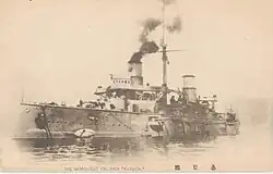 Kasuga and Nisshin reached Yokosuka on 16 February just as Japan initiated hostilities with its surprise attack on Port Arthur, and began working up with Japanese crews. The sisters were assigned to reinforce the battleships of the 1st Division of the 1st Fleet under the overall command of Admiral Tōgō Heihachirō on 11 April. In an effort to block the Russian ships in Port Arthur, Togo ordered a minefield laid at the mouth of the harbor on 12 April and Kasuga and Nisshin were tasked to show themselves "as a demonstration of our power".[12] Tōgō successfully lured out a portion of the Russian Pacific Squadron, including Vice Admiral Stepan Makarov's flagship, the battleship Petropavlovsk. When Makarov spotted the five Japanese battleships and Kasuga and Nisshin, he turned back for Port Arthur and his flagship ran into the minefield just laid by the Japanese. The ship sank in less than two minutes after one of her magazines exploded, and Makarov was one of the 677 killed. In addition to this loss, the battleship Pobeda was damaged by a mine.[13] Emboldened by his success, Tōgō resumed long-range bombardment missions, making use of the long-range capabilities of Kasuga and Nisshin's guns to blindly bombard Port Arthur on 15 April from Pigeon Bay, on the southwest side of the Liaodong Peninsula, at a range of 9.5 kilometers (5.9 mi).[14] In early May, the sisters fired at ranges up to 18 kilometers (11 mi) although this proved to be ineffective.[15]