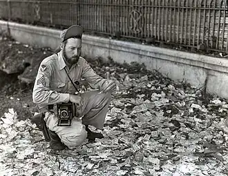 A photographer kneels on a street littered with invasion money, Rangoon, 1945.