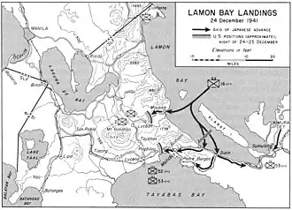 The Japanese Invasion of Lamon Bay (Filipino: Paglusob ng mga Hapones sa Look ng Lamon) was a secondary mission in the Japanese invasion of Lingayen Gulf during the 1941-1942 Japanese conquest of the Philippines. Securing the coast southeast of Manila would complete the Japanese encirclement of the capital and would act as a diversionary attack from the Japanese main invasion force from the north.[1]
