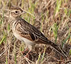 The Japanese skylark (Alauda arvensis japonica) is a subspecies of Eurasian skylark. Formerly, combined with five other subspecies of the Eurasian skylark, it was considered to be its own separate species (as Alauda japonica).