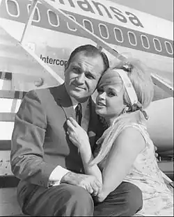In February 1958, the Tropicana Las Vegas launched Mansfield's striptease revue The Tropicana Holiday (produced by Monte Proser, co-starring Mickey Hargitay) under a four-week contract that was extended to eight.[133][134] The opening night raised $20,000 for March of Dimes ($218,000 in 2024 dollars).[6] She received $25,000 per week for her performance as Trixie Divoon in the show ($272,000 in 2024 dollars),[6] while her contract with 20th Century Fox was paying her $2,500 per week ($27,000 in 2024 dollars).[135][136][137] She had a million-dollar policy with Lloyd's of London in case Hargitay dropped her as he whirled her around for the show.[138][139] In 1959, Jayne returned to the Tropicana with her show being extended from a four-week run to eight when Betty Hutton's engagement there failed to materialize.[140] In December 1960, the Dunes hotel and casino launched Mansfield's revue The House of Love (produced by Jack Cole, co-starring Hargitay). She received a salary of $35,000 a week ($372,000 in 2024 dollars), the highest of her career.[141][142]