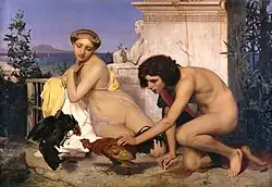 His painting The Cock Fight (1846) is an academic exercise depicting a nude young man and a very thinly draped young woman with two fighting cocks, with the Bay of Naples in the background. He sent this painting to the Paris Salon of 1847, where it gained him a third-class medal. This work was seen as the epitome of the Neo-Grec movement that had formed out of Gleyre's studio (including Henri-Pierre Picou and Jean-Louis Hamon), and was championed by the influential French critic Théophile Gautier, whose review made Gérôme famous and effectively launched his career.[5]