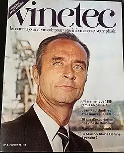In 1970, he was elected president of the wine merchants' union.[13] During the wine crisis, when he was president of the merchants, but also particularly appreciated by winegrowers for his successive positions in favor of a "decent" price for Bordeaux wine,[13] he was elected President of the Bordeaux Interprofessional Wine Council in 1972, where he was at the origin of important reforms on quality, communication with the general public and the protection of winegrowers in difficulty. It has therefore set up a bonus system for sellers not exceeding the optimum prices set by the CIVB.[14] He also negotiated a lighter regime for wine within the framework of the Évin law.[15] Following his mandate, he was named honorary president of the institution.[15]