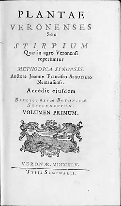 His written works include a detailed description of the flora in the vicinity of Verona, titled Plantae Veronenses, seu Stirpium quae in agro Veronensi repriuntur (3 volumes 1745–54).[8] Other noted works associated with Séguier are: