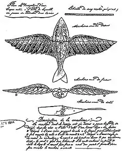 Le Bris built two different gliders. The first one, sometimes nicknamed La barque ailée ("The Winged Boat"), is the subject of his patent No. 31166 of 9 March 1857 on an "aerial car".[6] In late 1856, Jean Marie Le Bris flew briefly with this aircraft on the beach of Sainte-Anne-la-Palud (Plonévez-Porzay, Brittany), nearby Tréfeuntec in the Douarnenez Bay. The aircraft was placed on and tethered to a cart towed by a horse.[7] He thus flew higher than his point of departure, a first for heavier-than-air flying machines, reportedly to a height of 100 m (330 ft), for a distance of 200 m (660 ft).