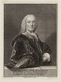 Jean Rousset de Missy (Laon, 26 August 1686 – Uithoorn?, 13 August 1762) was a French Huguenot writer, from early in life in the Netherlands. He was a renowned historian and author on international law and a prolific journalist. Born in Laon from Protestant parents (Jean Rousset and Rachel Cottin), he studied at the Collège du Plessis in Paris. After a conflict with his stepmother he joined the Dutch States Army during the War of the Spanish Succession and was present at the Battle of Malplaquet (1709). In 1724 (after having founded and led a school for aristocratic boys in The Hague), he started his activities as a professional journalist.[1]