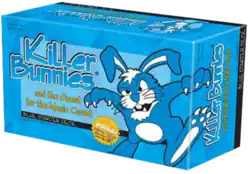 In 2004, the kids version of Killer Bunnies, KinderBunnies: Their First Adventure, was released. It is a very simplified and largely nonviolent game, created for children as young as five years old. The Sky Blue Starter Deck has very little reading and just a series of basic cards. The Sunshine Yellow Booster Deck (included in the same box as the Starter Deck) requires more reading and may not be suitable for the younger kids. In July 2024, Creative Team Alpha released five "promo" cards and a red 10-sided die,[1] and released KinderBunnies: Their Second Adventure the following October.[2] The KinderBunnies cards can also be added to the Killer Bunnies cards as additional booster decks.