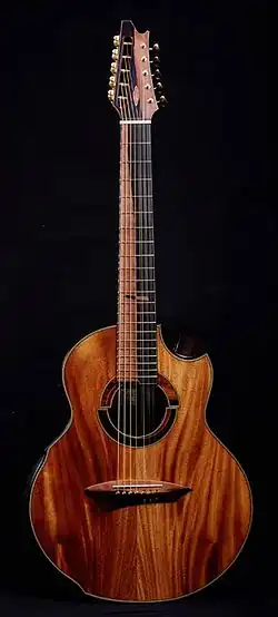 It has a monkeypod body, and a blackwood fretboard and bridge. The headstock is a half-slotted, half-pegged design.The sound hole, back, and bottom strap buttons are appointed unevenly, representative of a seismic shift. To get a chime sound, its D and G strings have octave pairs, and the B and high E have unison strings.