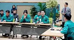 A briefing was held in a conference room at the Muan International Airport, where first responders from the Muan Fire Department provided information to family members of the passengers. Several attendees expressed anger for not receiving hourly updates promised by government officials, for not being allowed near the accident site, and for being given inconsistent reports on which passengers had died. Many also expressed anger at Jeju Air for holding their press conference in Seoul, with no company officials present at the Muan Airport briefing. Acting President and acting Prime Minister Choi Sang-mok visited the site of the disaster, where several family members of passengers expressed dissatisfaction to him regarding the lack of real-time updates for those affected.[119][120] He also visited a memorial altar for the victims in Muan on 30 December.[121]