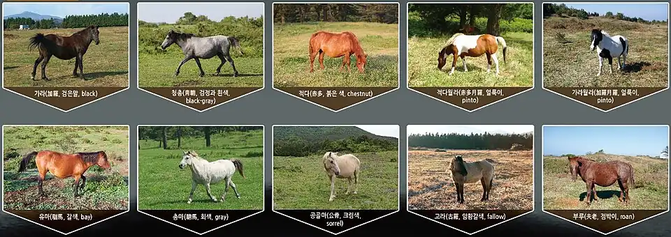 The Jeju horse (Korean: 제주마; Hanja: 濟州馬; RR: Jejuma) is a horse breed native to the Jeju Island in South Korea. There is a diverse array of types, each differently identified depending on their coat color. Jeju horses mature well in harsh conditions due to their strength and fitness. With an outstanding tolerance of low temperatures, they have been mostly pastured without the need for horse blankets or stables.