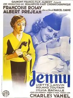 Jenny is a 1936 French drama film, the first full-length feature by Marcel Carné and the first of his successful collaborations with the dialogue writer Jacques Prévert and the composer Joseph Kosma. The screenplay is based on the novel La Prison de Velours by Louis Ribaud (1934). The leading roles are taken by Françoise Rosay, Albert Préjean, Charles Vanel, and Lisette Lanvin.[2] It tells the story of a middle-aged woman in Paris who with underworld support has built up a smart night club, but her life starts falling apart when the young gangster she maintains as her lover falls in love with her daughter. At times the film moves into the realm of poetic realism, where the cinematography, music and dialogue infuse the lives and surroundings of ordinary people with poetry.