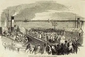 The Atlantic docked in New York on 1 September 1850. The following day, The New York Herald reported on "the spectacle of some thirty or forty thousand persons congregated on all the adjacent piers. ... From all quarters, crowds ... could be seen hurrying down towards the Atlantic's dock." So great was people's desire for a glimpse of the star that several people were "severely bruised, some came off with bloody noses, and two boys, about twelve years of age, appeared to be seriously injured. Had not the rush been checked in time, many lives would have been lost."[10] When she set foot on American soil, Lind kissed her hand to the U.S. flag and exclaimed, "There is the beautiful standard of freedom, which is worshipped by the oppressed of all nations."[8] She further endeared herself to the welcoming crowd by stopping Barnum's coachman from clearing a path through the throng with his whip.[8]