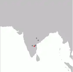 It is endemic to southern India, where it is principally known from southern Andhra Pradesh. It has an extremely limited geographical range being known from the Godaveri river valley near Sironcha[10] and Bhadrachalam, and from the Cuddapah and Anantpur areas in the valley of the Pennar River. An egg, probably collected within 100 km of Kolar in 1917, was positively identified as belonging to this species using DNA sequence comparison.[11][9] It is mostly active at dusk and during the night. It was first recorded in the mid 19th century; it was then considered to be extinct for more than 80 years, until it was rediscovered in 1986 at Cuddapah District, Andhra Pradesh. In Maharashtra it was reported at "24 km east of Sironcha, near the Godavari river, three birds, undated (Blanford 1867, 1869), and sometime in the 20-year period before 1935 (D'Abreu, 1935)".[12] The species was known from specimens collected at a few locations in eastern peninsular India and the currently known population is extremely restricted in range. Studies in this region using sand strips to detect footprints suggest that their preferred habitat has tall bushes at a density of 300 to 700 per hectare.[13][14]
