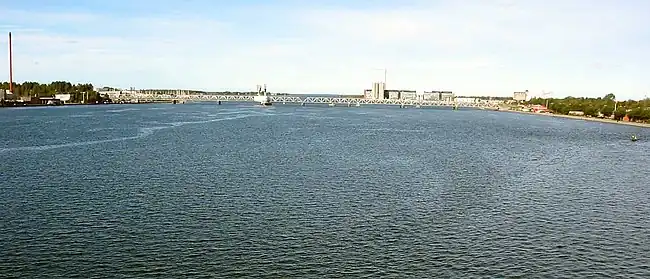 Since 2003, Jernbanebroen over Limfjorden (English: the Limfjord Railway Bridge) has been the official name for the railway bridge between Aalborg and Nørresundby, though colloquially it is simply called Jernbanebroen (English: the Railway Bridge).[1] Formerly known as Limfjordsbroen (English: the Limfjord Bridge), there is a road bridge to the east of the railway bridge, Limfjordsbroen, of the same name.