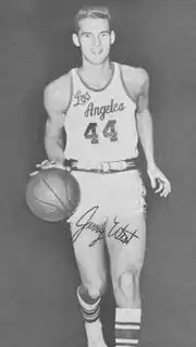 West made himself available for the 1960 NBA draft, and he was drafted with the second overall pick by the Minneapolis Lakers, shortly before the team relocated to Los Angeles. West became the first draft pick ever of the relocated franchise.[25] His college coach, Schaus, was also hired that same season to coach the Lakers. He played West as a guard, in contrast to West's college days as a forward.[10] The Lakers were captained by Hall-of-Fame forward Elgin Baylor, who was complemented by centers Jim Krebs and Ray Felix; forwards Rudy LaRusso and Tom Hawkins; and guards Rod Hundley (from West Virginia, like West), Frank Selvy, and Bobby Leonard.[26] This team perennially had strong forwards and guards, but was constantly weak at center, giving them a disadvantage against the Boston Celtics with their Hall-of-Fame center, Bill Russell.[27]