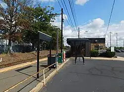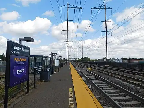 Jersey Avenue station has an unusual design compared to the stations along the Northeast Corridor Line. The station contains two low-level side platforms, one of which is on a siding track towards the namesake Jersey Avenue. The other is on the main Northeast Corridor Line tracks, but only on the westbound side. There is no eastbound platform along the Northeast Corridor tracks. All eastbound service to Penn Station in New York City from Jersey Avenue originates from Jersey Avenue station via equipment stored at County Yard. The westbound platform services only trains going to Trenton Transit Center.[35] All Amtrak services bypass the station. Due to the station having low-level platforms, it is the only Northeast Corridor Line station that is not handicap-accessible.[36] The station has a single station depot on the inner eastbound platform. A ticket agent is staffed in the waiting room during morning rush hours. There are two ticket vending machines also on the same platform.[35]
