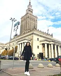 Jesica in front of the Palace of Culture and Science building in Poland, as she ready to compete for Miss Supranational 2019