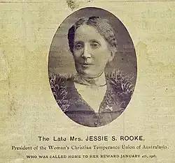 In 1898, Rooke became president of the Tasmanian WCTU branch, and in 1903, president of the Australian WCTU.[2]