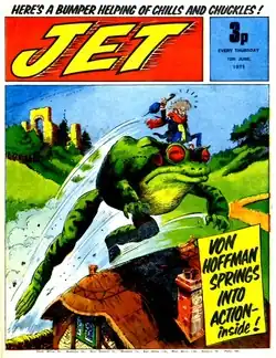 Priced at 3p and published on Thursdays,[7] to 40-page Jet failed to find an audience, however, and like Thunder was cancelled after 22 weekly issues.[4] Jet was merged into the long-established Buster, where four of the features - "Von Hoffman's Invasion",[8] "The Sludgemouth Sloggers", "Faceache" and "The Kids from Stalag 41", would continue.[9] "Faceache" in particular would have a long run, lasting until 1988 in Buster and becoming a well-remembered strip. Despite the weekly's short life, a Jet Annual would still be published in the autumn for the 1971 Christmas market, while the name Buster and Jet remained in place until 9 June 1974.[3]
