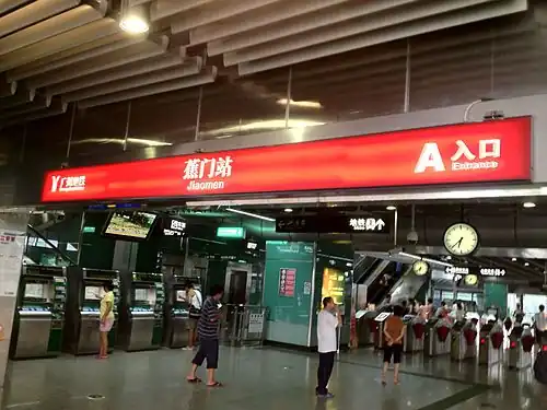 Jiaomen Station (simplified Chinese: 蕉门站; traditional Chinese: 蕉門站; Cantonese Yale: Jīumùhn Jaahm) is an elevated station of Line 4 of the Guangzhou Metro. It started operations on 28 June 2007. It is located at the junction of Nansha Avenue[1] and Fenghuang Avenue[2] in the town of Huangge, Nansha District.[3][4][5]