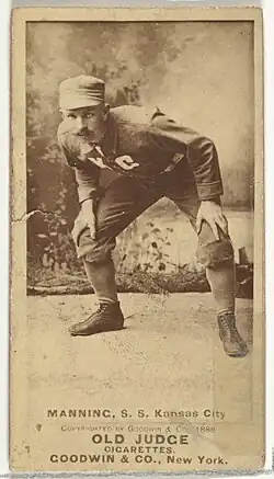 Manning spent all or parts of six seasons with the Kansas City Cowboys from 1887 to 1892. He was acquired from Detroit in the middle of May 1887, and by the middle of July, Manning was referred to in The Sporting Life as "the best and most popular player that ever wore a Kansas City uniform."[6] He was reclaimed by Detroit for 13 games in July, but then returned to Kansas City in the middle of August.[8] Manning compiled a career high .433 batting average in 381 at bats for the 1887 Cowboys.[9] He played at shortstop for the Cowboys in 1887 and performed well defensively, the Kansas City correspondent to The Sporting Life calling him "the greatest of shortstops at short field."[10]