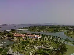 ![]() An aerial view of Jimei District (foreground and center), connected by numerous bridges with Xiamen Island's Huli District (in the background right, including Xiamen Gaoqi International Airport). | |