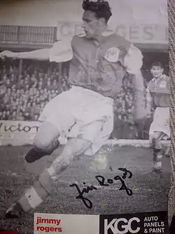 Jimmy Rogers was a livewire opportunist who delighted in telling the world that he was lethal in front of goal – from six inches![2] Rogers was equally effective on the wing or at centre forward. In particular he had an instinct for rebounds that verged on the uncanny. The description "poacher" could have been coined for Rogers. Rogers had fine ball control and bags of determination, he was also firmly of the "if they kick me then I'll kick them back" persuasion and few defenders were able to intimidate him. In summary Jimmy Rogers was a humorous and intelligent person.[2]