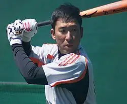 Jin Nakatani (中谷 仁, born May 5, 1979) is a Japanese former professional baseball catcher in Nippon Professional Baseball (NPB). He played for the Hanshin Tigers in 2002, the Tohoku Rakuten Golden Eagles in 2006, and from 2008 to 2011 and for the Yomiuri Giants in 2012. Following his retirement from the NPB, he managed at the Chiben Wakayama High School baseball team.[1]
