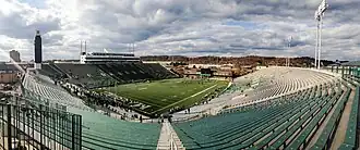 Joan C. Edwards Stadium, formerly Marshall University Stadium, is a football stadium located on the campus of Marshall University in Huntington, West Virginia, United States. It currently can hold 30,475[3] spectators and includes twenty deluxe, indoor suites, 300 wheelchair-accessible seating, a state-of-the-art press-box, 14 concession areas, and 16 separate restrooms.[4] It also features 90,000 sq ft (8,000 m2) of artificial turf and 1,837 tons of structural steel. It also houses the Shewey Athletic Center (Marshall University), a fieldhouse and a training facility. The new stadium opened in 1991 and replaced Fairfield Stadium, a condemned off-campus facility built in 1927 in the Fairfield Park neighborhood.