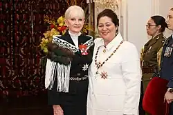 Withers (left), after her investiture as a Dame Companion of the New Zealand Order of Merit by the governor-general, Dame Cindy Kiro, at Government House, Wellington, on 4 September 2024