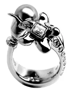 In London, Angelett continued to work on and expand the Royal Garden collection inspired by the Australian nature. An example from the collection is the ring Veronica Perfoliata created with the use of CAD and laser technology.[20] In parallel with modern techniques Angelett is continuing to use the ancient technique of cloisonné, which was used in the Cup of David in Australia. The Holy Kingdom Ring, designed by Angelett in London for the former Governor-General of Australia Dr Hollingworth, is implemented in this technique. The Holy Kingdom Ring is "Manifestation of biblical passage which painted a picture of Holy Kingdom with the image of Jesus Christ depicted in ancient technique of polychrome cloisonné enamel".[13] For creation of this ring Angelett conducted research on "remarkable collection of papal rings, dating back to fourteenth century"[13] in the British Museum in London.