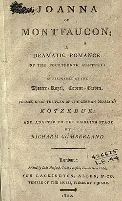 Joanna of Montfaucon is an 1800 historical play by the British playwright Richard Cumberland.[1] It premiered at the Theatre Royal, Covent Garden in London on 16 January 1800 and was inspired by a work by German writer August von Kotzebue.[2] The original cast included Maria Ann Pope as Joanna, Alexander Pope as Albert, Lord of Thurn, Joseph George Holman as Lazarra, Charles Incledon as Darbony, John Waddy as Wensel, Henry Erskine Johnston as Philip, John Emery as Guntram, Charles Murray as Hermit, Joseph Shepherd Munden as Wolf, Thomas King as Ulrick, William Claremont as Mountaineer, Charles Klanert as Soldier and Nannette Johnston as Eloisa.