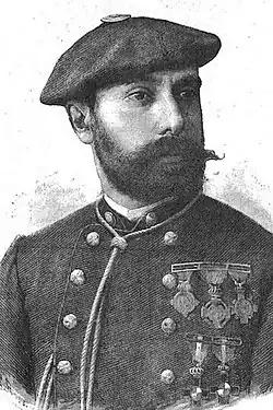 With the siege of Bilbao broken the Liberal troops continued their advance on Estella; Lloréns was fighting in the victorious Abárzuza and Oteiza battles in the summer of 1874, which eventually led to the stalemate period that followed.[16] Struggled to sort out the Carlist artillery logistics, making sense of wide variety of artillery pieces available.[17] He participated in the February 1875 battle of Lácar, which is sometimes considered the most brilliant and daring Carlist victory of the war and which threatened the new king Alfonso XII, present at the site, personally.[18] He took part in one of the last confrontations of the conflict, the battle of Palomeras de Etxalar (February 1876).[19] His performance during the assault on Lumbier (October 1875) gained him Cruz Roja del Mérito Militar, with the second one obtained for directing artillery fire during the battle of Mañeru.[20] Wounded in action a number of times.[21] Following the battle of San Pedro Abanto he was nominated a captain,[22] following the battle of Salvatierra/Agurain he rose to a comandante,[23] and he finished the war as a colonel.[24] Following the Carlist defeat in 1876 he accompanied Carlos VII into exile and crossed the French border.[25]