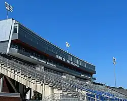 The press box and suites are located above the bleachers on the home side of Joe Aillet Stadium. Originally built in 1968 and expanded in 1988, the sky box was renovated and replaced in time for the 2017 season. The first floor of the facility includes multiple luxury suites for fans; and the second floor includes room for coaches, broadcast members, and gameday officials.[22] Additional signage was added onto the front, in time for the 2023 season, which highlighted the program's 3 national championships and 3 retired jersey numbers.