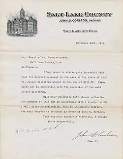 In 1914, John G. Morrison, a Salt Lake City area grocer and former policeman, and his son were shot and killed by two men.[7] The same evening, Hill arrived at a doctor's office with a gunshot wound, and briefly mentioned a fight over a woman. He refused to explain further, even after he was accused of the grocery store murders on the basis of his injury. Hill was convicted of the murders in a controversial trial. Following an unsuccessful appeal, political debates, and international calls for clemency from high-profile figures and workers' organizations, Hill was executed in November 1915. After his death, he was memorialized by several folk songs. His life and death have inspired books and poetry.