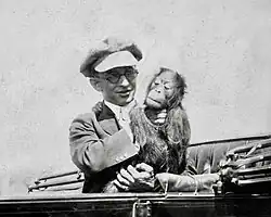 Around 1915, an animal trainer named Curley Stecker began taking care of Joe Martin.[40] According to Frank Buck, Joe Martin was cross-fostered by the Steckers: "He was taken into Curley's house to be raised...[and] grew up with the Stecker son".[41] Curley is sometimes credited with "discovering" Joe Martin;[33] they worked as a team for the next eight years.[42] Stecker's family would sometimes appear alongside Joe Martin in films.[43][44][45][46] The Stecker family rented a house across the road[22][47][48] from the studio zoo, the zoo having been created in part as a "point of interest" at Universal City.[49] The keepers were responsible for introducing the animals to visiting dignitaries;[50][51] one such visit was made by Bishop Hanna of San Francisco in 1915.[52] Later, one of Joe Martin's directors wrote of the visit: "A famous old prelate came out to Universal City to see Joe. Joe listened while the old gentleman commented on the wonders of nature. 'You wouldn't catch a monkey taking a drink of vile liquor,' he observed. Joe reached in the hip pocket of his little pantaloons and came out with a pint of liquor, which he offered to the bishop with fine courtesy."[53]