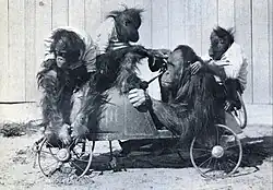 Three juvenile orangutans, said from to have come from Borneo in crates stuffed with "jungle grass," joined the Universal City menagerie around March 1921.[102] Two, called Jiggs[k] and Kelly, had their own enclosure with a "heat plant" and wore "little pneumonia jackets of flannel Mrs. Stecker has made for them."[22][l]