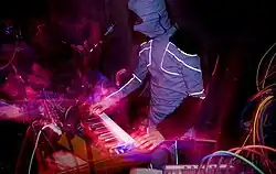 Karam plays an assortment of analog synthesizers, including various Moog models and a patch-panel modular synth.
